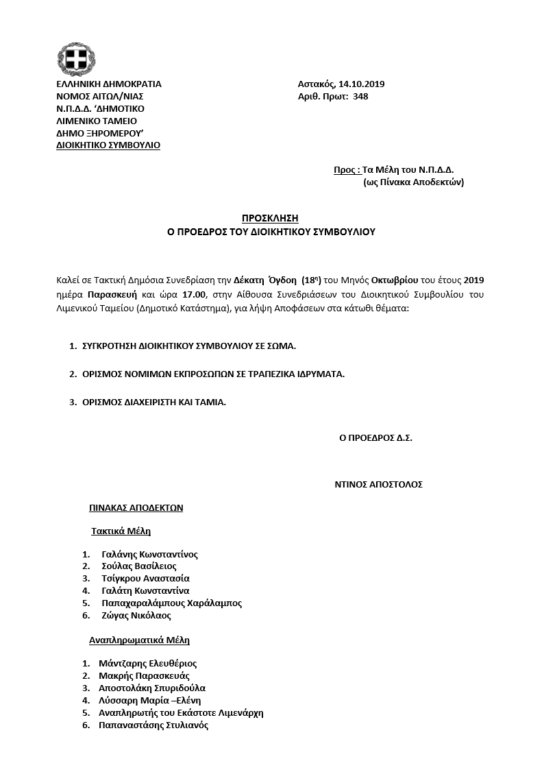 Τακτική Δημόσια Συνεδρίαση του ΝΠΔΔ "Δημοτικό Λιμενικό Ταμείο Δήμου Ξηρομέρου" την Παρασκευή 18 Οκτωβρίου