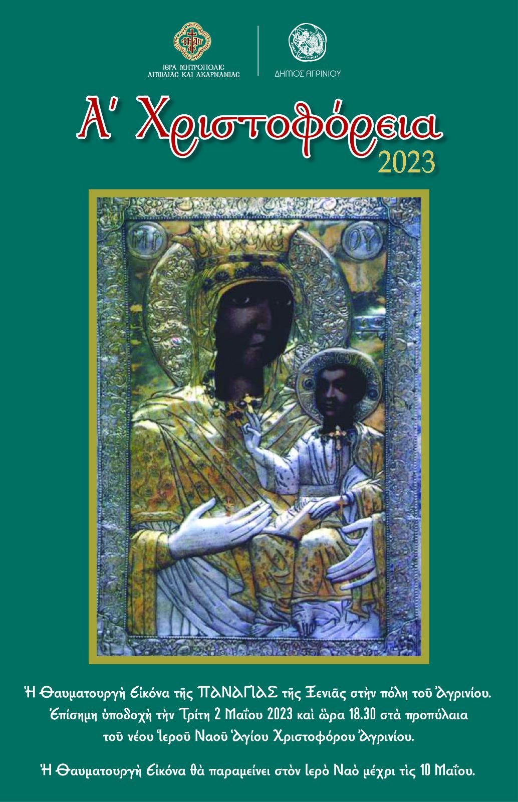 Η επίσημη υποδοχή της Ιεράς και Θαυματουργού Εικόνος θα πραγματοποιηθεί την Τρίτη 2 Μαΐου 2023 και ώρα 18:30’ από τον Σεβασμιώτατο Μητροπολίτη Αιτωλίας και Ακαρνανίας κ. κ. Δαμασκηνό, στα προπύλαια του νέου Ιερού Ναού του Αγίου Χριστοφόρου.