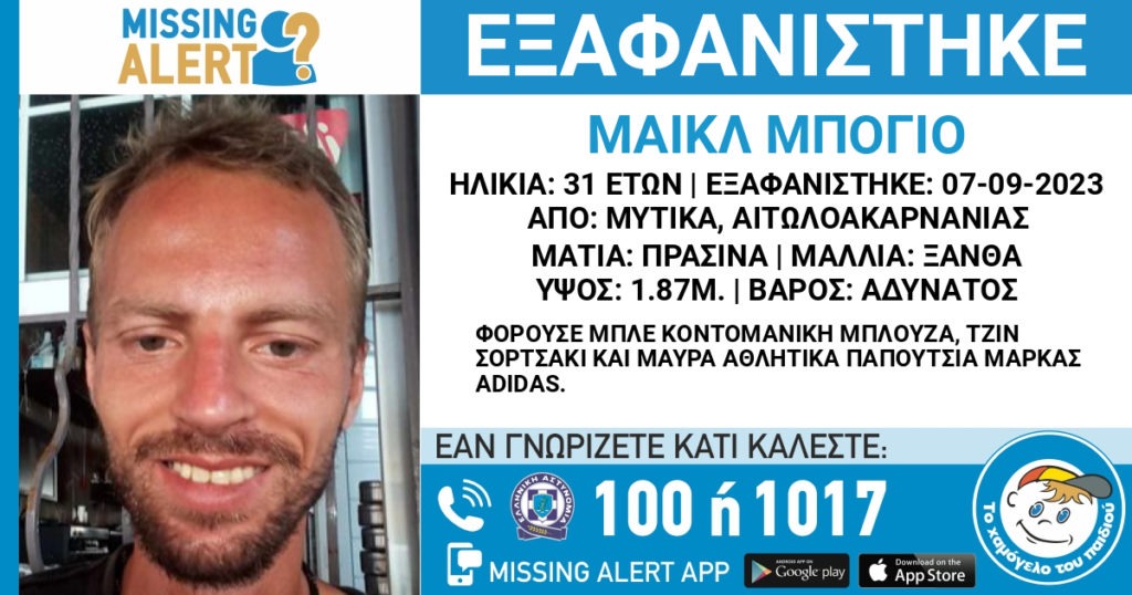 «Στις 07/09/2023, πρωινές ώρες, εξαφανίστηκε από την περιοχή του Μύτικα Αιτωλοακαρνανίας, ο Μάικλ Μπόγιο, 31 ετών. Το «Χαμόγελο του Παιδιού» ενημερώθηκε στις 07/09/2023 για την εξαφάνιση του Μάικλ Μπόγιο και άμεσα προχώρησε στη δημοσιοποίηση των στοιχείων του ενήλικα κατόπιν αιτήματος της οικογένειας του, καθώς συντρέχουν σοβαροί λόγοι, οι οποίοι θέτουν τη ζωή του σε κίνδυνο. Πληροφορίες αναφέρουν πως ενδεχομένως, να βρίσκεται στην περιοχή της Αθήνας.